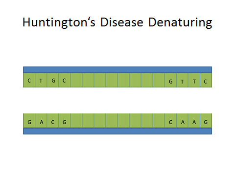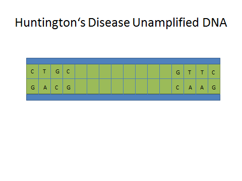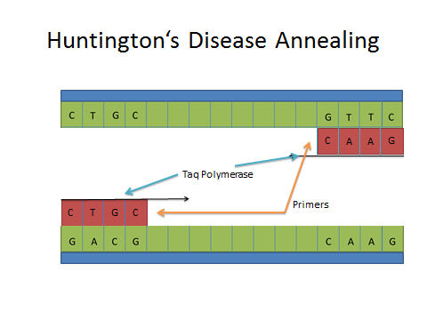 The sequence for Huntington's Disease we decided to focus on is rs2857936, which causes an A to change to a G. The specific primer sequence that we located for this disease was GGCTGCTTTTC[A/G]TTGAAAAG. Following the DNA strand to the left, the specific primer for this type of genetic HD variation was found. According to Dr. Haynes, only 150 BP to the left are needed, so we only went 150 BP to help increase the speed of the PCR. The DNA primer sequence is CTGCACTTGACATGATGTTC (http://www.ncbi.nlm.nih.gov/snp?term=Rs7665116), which can be used to help identify DNA with this genetic variation present. And the reverse would be ACAAGTGAATCGTTAACAG.