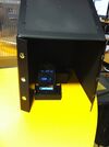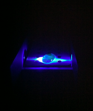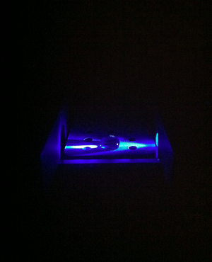 Steps to set up the Flourimeter: 1. Obtain a glass slide specially designed for flourimeter procedure. 2. Place the slide on the device with the light and line up the light so that it is shining between two of the circles. 3. Turn the box upside down and un-buckle one of the sides so that it can be moved up and down. 4. Put the device with the blue light under the box in the back and place the phone stand in front of it. 5. Put a phone in the phone stand (iPhone 4 was used in this lab) and move the stand close enough to take a picture. 6. Place a drop of SYBR Green on one of the circles and a drop of whatever is being tested on the circle behind it. They should merge to be one big droplet. 7. Close the box as close to all the way as possible and take a picture using the phone with no flash. 8. Record image number and sample type.