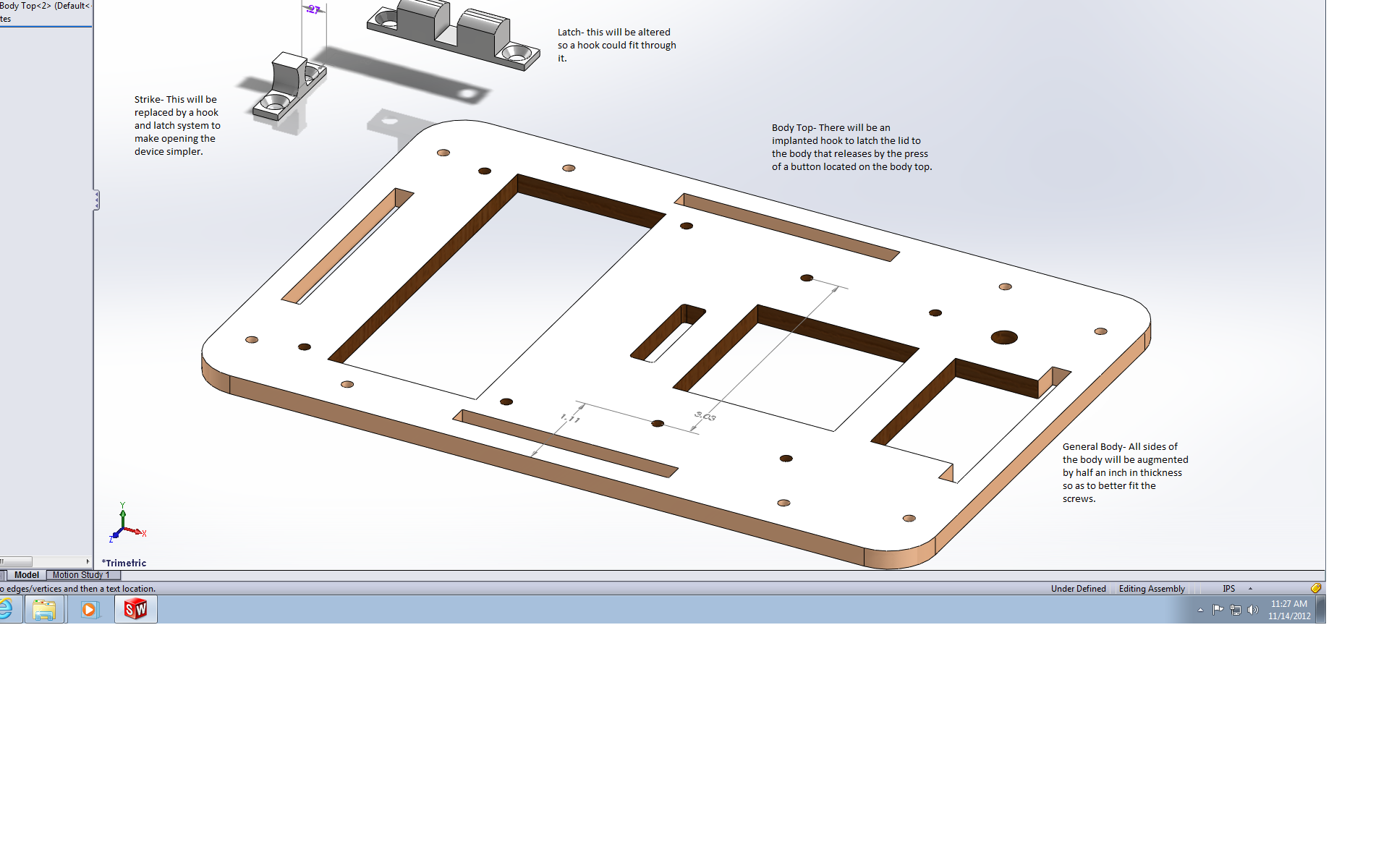 Clearly our group was greatly focused on correcting the lid-opening system for the top of the lid to the box. We focused on designing a new hook-and-latch system for the lid because we felt that the nature of the current system was very inconvenient to the user. The current model is more difficult to open and yanking the system can create potential for harm to be done to the DNA samples as well as to the machine. Our new design corrects this by allowing means for a smooth and easy opening motion; the samples are still protected because the lid is secured by a hook when closed. Considering that our other modification by making the sides thicker was a means to make assembling the device easier, it is reasonable to conclude that overall, we were focused on making a more user-friendly device.