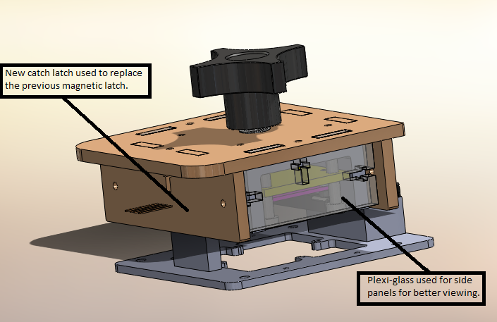 The redesigned version of the Open PCR system focused on resolving the issues that surrounded the function of the Open PCR machine's lid. One modification made was the changing of materials used in production of the PCR lid. In the original structural design wood was the main material of the Open PCR's lid. This redesign changes the material used on the sides of the lid from wood to plexi-glass. The use of plexi-glass allows for the user to see into the lid of the Open PCR machine.This change allows the user to view the height of the heat plate while adjusting it, therefore minimizing the the chance of the user crushing the DNA samples while lowering the heat plate. The other modification present in the redesign was that the magnetic clasp from the original design was replace by spring catch. The original magnetic clasp on the PCR required too much force to open. While this magnet prevented the lid to open mistakenly during an experiment, it made the machine vulnerable to breakage when the lid needed to be opened. The newly added catch provides the same amount of protection in terms of mistaken lid opening but it also increases ease of use and limits the chance of breakage while opening the lid.