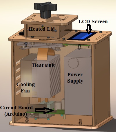 LAB 1 WRITE-UPInitial Machine TestingThe device depicted above is an open PCR(Polymerase Chain Reaction), and is used for the amplification of DNA. It works by heating and cooling the DNA samples allowing for the splitting and recombination of the DNA with the primers located in the solution. To accomplish this, the device connects to the USB port of a computer where the format of the cycles are inputted. From there the device repeatedly heats and cools via the heated lid, heat sink, and fan. The information is then fed to the Arduino board which controls the heating and cooling as well as transferring the information to the LCD screen. Experimenting With the Connections When we unplugged part the LCD screen(part 3) from the Arduino(part 6), the LCD display went black and ceased to work. When we unplugged the white wire that connects the Arduino(part 6) to the PCR block (part 2), the machine relayed a temperature reading of -40˚C, indicating a malfunction and the temperature could not be accurately determined.