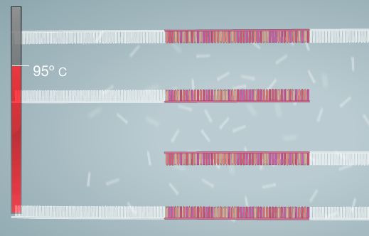 Polymerase Chain Reaction Polymerase Chain Reaction is used to amplify DNA. In order for this process to be successful, Template DNA must be replicated. A template of DNA consists of a strand in which the order of the nucleotides (bases) is known. With this information, it is possible to replicate the DNA strand by using heat, primers, and polymerase. The process begins by combining the DNA and the master mix. The master mix is composed of all of the necessary ingredients for the completion of the PCR process. The DNA is then placed into a PCR machine, or thermal cycler. The DNA is heated in the thermal cycler, allowing it to denature, or separate into two strands. The primers are then added to the template strand. They mark the start and end points of the specific sequence that is being targeted for replication. Next, the cycler is once again heated. This allows for the polymerase enzyme to activate and to begin adding nucleotides to the DNA strand. At the end of this process, two strands are created (essentially each strand of DNA has one side composed of new nucleotides that are added by the polymerase and the other composed of the original nucleotides, thus allowing for a total product of two strands). The machine is then cooled and re-heated again. This cycle is generally repeated for 20-30 cycles, or until the desired amount of target DNA sequence strands is reached. The composition of the master mix is listed below. Steps to Run PCR