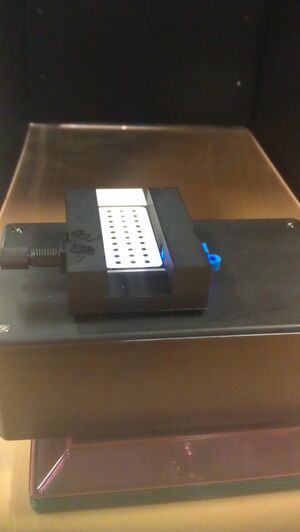 Turn on blue fluorescent light and make sure that the beam is shined between the first two rows of the dotted slide.