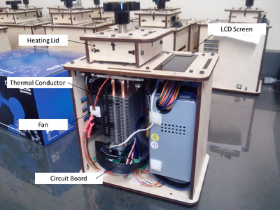 The picture to the right shows the design of the open PCR machine used in class (click to enlarge). This PCR machine is compact, inexpensive, and easy to use in comparison to professional grade PCR equipment making it ideal for student and school use. The machine is composed of an LCD screen, heating lid, mother board (circuit board),thermal conductor and a fan.