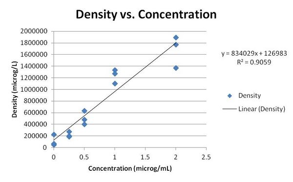 In order to set up the calibration, the fluorimeter was placed inside a black box. A slide was slid into the fluorimeter where the drops of DNA sample will be placed. The phone cradle was then placed about 11 cm from where the drop was placed on the slide. From there, the sample of DNA was placed on the slides using a pipet. The smart phone was then placed on the cradle, the lid of the black box was closed, and a picture was taken of the drop of DNA sample. This process was repeated with every DNA sample.
