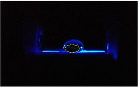 The Single-Drop Fluorimeter consists of a small, simple plastic box with a apparatus situated on the top where the multi-welled slide can fit in. It has a switch located on the right hand side that allows for the LED light to be turned on or off. The slide of the fluorometer is align so that the blue LED shines through a drop placed over two middle wells. The slide has holes along it to allow for a sample to be placed in them.