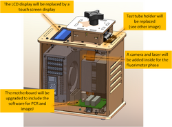 Because the new design is all inclusive there is no need to remove the DNA from the machine throughout the entire process. The test tube holding tray of the old open PCR system (image on the right) will be replaced by a tray that will hold the test tubes like a rack allowing them to hang freely. This will not only allow for better (faster) heating/cooling, but will allow for the fluorimeter analysis to be done without removing the DNA from the system. After the user adds the SYBR green to each DNA sample in the test tubes, the system will automatically shine a laser through the clear test tubes and cause the DNA samples to become florescent. A built in camera will image each sample of the florescent DNA.