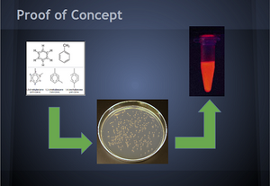 For our testing, we will examine the relationship between the level of concentration of the chemical compound toulene and the level of fluorescence. The fluorescence from DH5α cells harboring the constructed biobrick with the xylr protein will be measured at various concentrations of toluene.