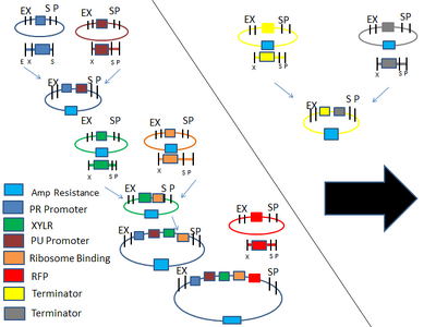 Key Pre-existing Part: We are currently using biobrick parts that was used for a similar project. The Pu and Pr promoters was created by the Michigan 2009 iGEM team. Because the projects are very similar, we hope to differentiate our project in the long-term by incorporating our constructed biobrick into a plant. When toulene or other aromatic compounds bind to the xylr protein, the plant would turn red. Right now, we are just testing our proof-of-concept in E.coli.