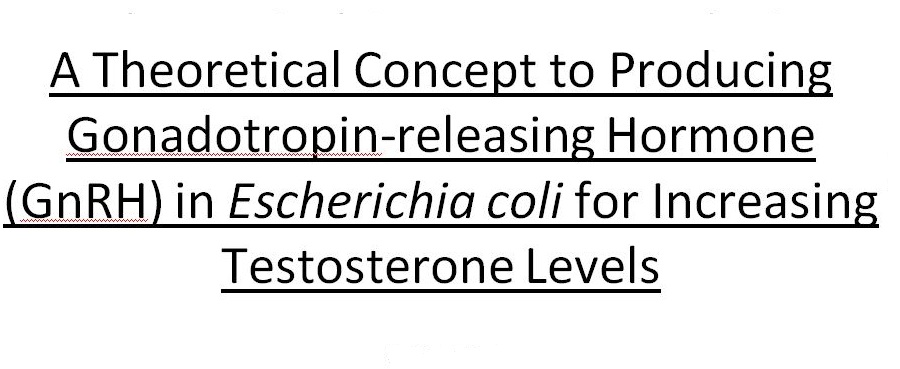 ABSTRACTIn this study we looked at the possibility of making an E. coli strain that has a plasmid which will allow for the production of gonadotropin-releasing hormone (GnRH) to help increase the level of testosterone. Low levels of testosterone stimulate the production of GnRH which indirectly stimulates the production of more testosterone via lutenizing hormone and follicle stimulating hormone. To show proof-of-concept, two plasmids were constructed working as a repressilator to have isolated production of both GnRH and the reporter molecule green fluorescent protein (GFP). Theoritically, having one plasmid create GnRH and the repressor for the GFP plasmid and the other plasmid create GFP and repressor for the GnRH plasmid will allow for isolated production of both to show expression characteristics of GnRH being produced. Further testing must be done to address correct protein folding and activity. Using this proof-of-concept, it is hoped to develop a human-viable chassis to help those affected with hypotestosteronism. However, human practices involving genetically modified organisms to be “implanted” or given to humans still remains subject to debate in the scientific community.