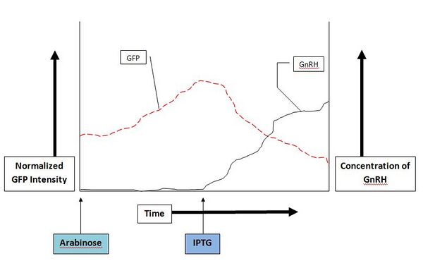 PROOF OF CONCEPT DESIGNThe natural part for our project is Gonadotropin Releasing Hormone (GnRH) and has the gene #2796 in NCBI GeneBank database[1]. Although this gene is 5,783 bp in length, the actual protein created from the gene is only 279 bp in length. We plan on having the cDNA of this gene synthesized for us to also include the BioBrick prefix and suffix and then use it for other cloning purposes to create our proof-of-concept test system. Also, we plan on having the GnRH exported from the E. coli cell with the use of a 60 bp signal from HlyA to use the T1SS[2]. While this is a proof of concept test, eventually there will be the need to export the protein if this project moves into human systems. This 60 bp will be added to the C-terminus of GnRH to where then the prefix and suffice with flank the entirety. With the prefix and suffix the gene is a total of 320 bp in length. With the signal sequence the gene is 380 bp in length.