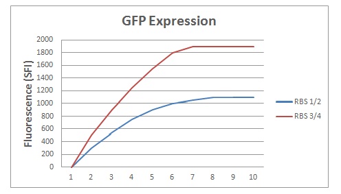 Because our plasmid has ampicillin resistance and standard BioBrick restriction sites, it is fairly easy to construct our genes in the way we specify in the schematic to the right. The addition of each consecutive gene is rather formulaic. Say, for example, that we have a kanamycin resistant plasmid with a BioBricked form of RFP. Because this part is already a biobrick, it will have the E, X, S, and P restriction sites present in the nucleotide sequence. We can cut the DNA at the X and P sites to prepare the gene to be added to a new plasmid. In our specific case, our next gene is a ribosome binding site. We can prepare the plasmid containing the RBS by cutting at the E and S sites, which will then allow it to receive the RFP. Then, the environment can be treated with ampicillin, which will remove all of the plasmids from which the RFP was taken, preserving the new plasmids which have ampicillin resistance. We can repeat this same process for the addition of each gene.