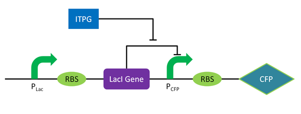 The switch is designed so that under normal conditions LacI is produced, the LacI regulated promoter (PCFP) is consequently inhibited, and CFP production is inhibited. However, when IPTG is added to the system, it binds to the LacI protein that is being created and subsequently prevents the LacI from inhibiting PCFP, once PCFP is no longer inhibited, the system produces CFP. When the CFP promoter is active, the system will produce a fluorescent cyan color.