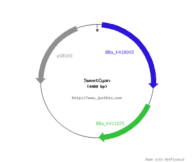 The following table lists the BioBricks used in the construction of the Sweet Cyan device. The individual parts can be found with a simple search of the part IDs at the Parts Registry.