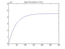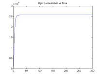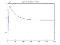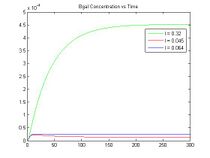 The initial concentration of IPTG has a direct influence on the rate of βgal production and thus has a point where this rate is in equilibrium to the rate of βgal degradation which increases with the production of more βgal. Because the rate at which β-galactosidase is being produced must interact with the degradation rate of β-galactosidase, the production starts to cap off at around time = 100 with an approaching βgal concentration of about 4.52 x 10-4 where slope is 0, reaching saturation as seen in the original model. As the initial concentration of IPTG goes down (say 0.045), β-galactoside production rate isn't in equilibrium with the degradation rate till quite some time after an initial spike due to the always available mRNA seen as the IPTG input decreases, and so β-galactoside production is never 0. Even at this point however, the output of IPTG is still not quite sustained although a pattern is evident. As soon as the concentration gets to around 0.064, visible equilibrium is seen between production and degradation at a time of around 10 and a concentration of about 2.56 x 10-5 and thus a threshold is found with this sustainable βgal output where the equilibrium concentration is equal to the concentration caused by the initial mRNA. All four initial concentrations can be compared in figure 4.