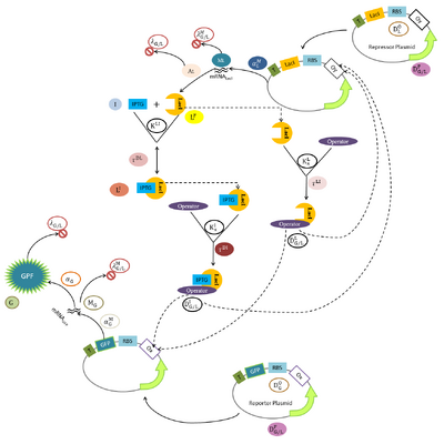 This model assumes that IPTG stays constant over time although realistically IPTG would of course fluctuate or run out as time would go on. Some more terms/variables are taken into account as well: