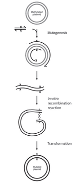 After the part has completed the mutagenesis, the DNA sequence (which is linear at this point in time) undergoes in vitro recombination reaction. The host cell then "circularizes" the mutated part DNA and digests the original methylated plasmid. If the methylation of the original plasmid is skipped, an additional purification step would be necessary to extract the mutated plasmid.[5]