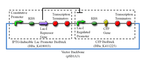 The BioBricks for our design came from the Registry of Standard Biological Parts. Our system utilized two main BioBricks along with an appropriate vector backbone (see figure below).