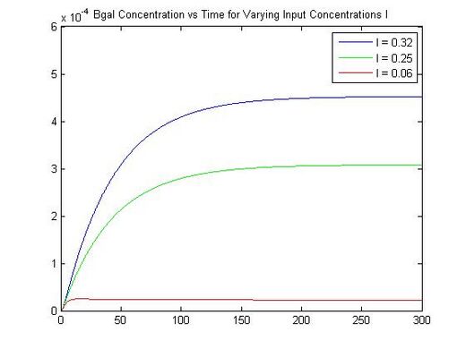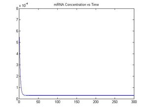 Changing the input parameters and observing the simulated response would allow us to decide what levels of input concentration would be beneficial for Bgal output. Therefore, we varied the parameters in search of a cutoff input concentration level, above which would produce a sustained Bgal output, and below which would produce a declining output over time. After simulating several different initial concentrations, we found that the turning point occurred at about I = 0.063. Figure 4 shows the resultant mRNA concentration in this case. The Bgal concentration over time was also graphed for this input concentration and appears as the bottom red curve in Figure 3. Therefore, transcription and the output Bgal decrease over time for an input concentration of I = 0.06, below the threshold we found.