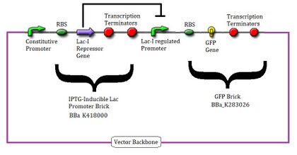As stated above, the device circuit is made out of 3 parts: The IPTG inducible Lac promoter cassette, the GFP brick and the vector. Listed below, are all the details and specifics for each part.
