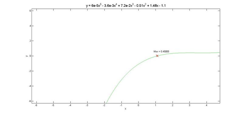 As described above, fitting this data to a mathematical equation allows us to solve for parameter values of the system, from which we can infer information about production of the output. The Hill Coefficient, n, can be found from this fit. The Hill Coefficient occurs at the inflection point of the rising output curve, meaning it represents the maximum rate of GFP production. The parameter K described above is related to the Hill Coefficient, n. K represents the input concentration at which n occurs. In our mathematical model, K and n are the x and y values at which the inflection point of the GFP production curve occurs. The inflection point of the curve corresponds to the maximum of the derivative of the curve. Therefore, the maximum rate of GFP output production would occur at the maximum of the derivative curve of the polynomial fit equation. To find the maximum rate of GFP production relative to changing input concentration, this derivative was graphed and its maximum was found.