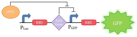 Circuit diagram showing input IPTG and output GFP. PLac refers to the promoter for the creation of LacI; PGFP refers to the promoter for the creation of GFP, which is regulated by LacI.