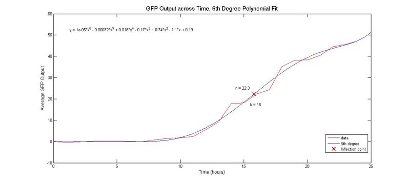ImageJ software was used to track output data of one cell at a time across the 24 time points. The average intensity of the image across the chosen cell was recorded for each frame, since this brightness would correspond to GFP output level. Data of this nature was recorded for 8 different cells, allowing for the calculation of an average brightness or GFP production level at each frame or time point. This average production over time was then graphed using MatLab. Using MatLab's native fitting tools, a 6th order polynomial was fit to the plot and the equation for this polynomial was generated, as shown below.