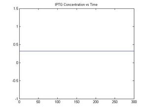 When analyzing this model, we were concerned with three main things: how mRNA concentration changed over time, how IPTG concentration changed over time, and how the concentration of β-galactosidase changed over time. We ran a simulation setting the concentration of IPTG at an arbitrary value of 0.32 and produced the graphs of mRNA concentration over time (Figure 1) and IPTG concentration over time (Figure 2) as shown. The concentration of β-galactosidase over time for this input concentration is the top blue curve in Figure 3.