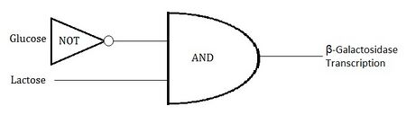 If we analyze it from a digital logic context, we can describe glucose and lactose as inputs, and the transcription of β-galactosidase as an output. Furthermore, we can build a logic circuit symbolizing the operon's functionality (illustrated in diagram on left). When glucose acts as an input, it produces a NOT gate functionality (See Table 2).