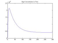 Finally, we adjusted the concentration of IPTG to attempt to find a value that would result in no Bgal being produced. We were able to determine that the lowest value of IPTG concentration that did produce a Bgal output was 0.021 mM of IPTG. Any concentration of IPTG below this value resulted in the lowest observable output of Bgal: approximately 0.4 x 10-5. However, even at this concentration of IPTG, trace amounts of mRNA were still present in the system. These amounts decreased immediately after our model started to run but were still high enough to continue to initially drive transcription. Thus, an initial spike of Bgal output was observed at 0.021 mM of IPTG. Shortly after almost all mRNA had degraded, the total amount of Bgal had degraded to the minimum threshold value of 0.4 x 10-5. Because the mRNA in the system never completely degraded, we never observed a complete lack of Bgal output. The resulting data can be seen in Image 3 to the right.