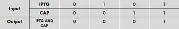 AND gate Gene Switch: Both [IPTG] AND [Low Glucose Levels] conditions must be met for GFP productionTruth table describing inputs required to produce an output
