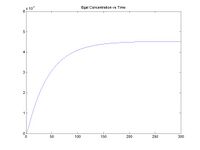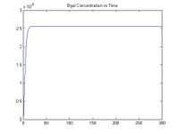 When interacting with the MATLAB model, we were able to analyze three outputs: concentration of IPTG over time, concentration of β-galactosidase (Bgal) over time, and mRNA concentration over time. Our focus was on how the concentration of Bgal changed over time as we adjusted the input concentration of IPTG. The default concentration of IPTG was set to 0.32 mM. The Bgal concentration over time when the input IPTG was set to this value can be seen in Image 1 to the right.