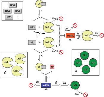 Network diagram of our device showing variables and parameters used by Ceroni, et al. IPTG and LacI bind together to form a dimer (D). In the presence of the dimer and the activated promoter (AP), green fluorescent protein is produced (GFP).