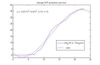 We explored how one technique, imaging via microscopy could be used to determine the production rate of an output protein, in this case GFP in yeast, could be used to determine a "real" value for maximum GFP production rate under our own laboratory conditions. To accomplish this, we used ImageJ to identify specific cells in a series of images that ranged from maximum GFP output to virtually no GFP output. We tracked these cells throughout the image series and used ImageJ selection tools to give us an average brightness, or simulation of GFP output, per cell per image. We used these brightness values to generate a plot in MATLAB that showed a rough value of how the GFP output in our cells increased over time. Applying a best fit curve to our data, we found that a cubic equation generated the closest fit to our data. These data can be seen in Image 4 to the left.