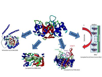 More recently we have been exploring the cofactor and substrate specificity of the AhdD enzyme which is an AKR from the hyperthermophilic archeon Pyrococcus furiosus. This enzyme natively uses NAD(H) as its preferred cofactor and the mutations used to alter cofactor specificity in 2,5-DKGR were used to similarly broaden the cofactor specificity of AdhD. The mutant AdhD is also able to use biomimetic cofactors, and we have used this mutant to create an enzymatic biofuel cell using an biomimetic cofactor for redox cycling. We have also explored swapping the substrate-binding loops in AdhD to alter its substrate specificity in addition to its cofactor specificity. AdhD is a valuable enzymatic scaffold for engineering enzymes with high thermostability.