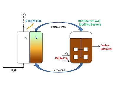 We are developing an "electrofuels" process which consists of an electrochemical reactor that reduces a mediator molecule which can subsequently deliver electrons to microbes within a bioreactor. In our approach, we have chosen to use iron as the mediator and we have identified a unique bacterium, Acidithiobacillus ferrooxidans, which can grow by oxidizing iron using CO2 as a carbon source. We have developed novel reactor designs and medium formulations to grow the cells efficiently in the electrofuels platform. And, we have developed a genetic system for the bacterium so we can introduce foreign metabolic pathways into the cells to enable them to produce new fuels and chemicals. The net result of this platform is the production of chemicals and fuels from electricity and air, and this could be a pathway forward for eventually producing transportation fuels from CO2 and renewable energy (such as solar).