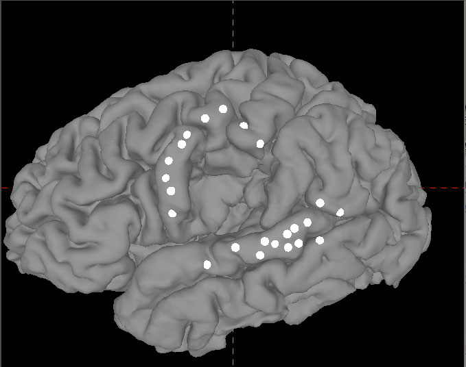 Cortical surface model displayed in SUMA with 1D file overlaid depicting the locations of stimulation: