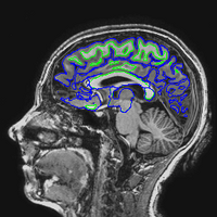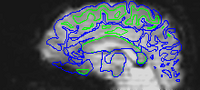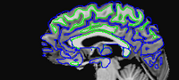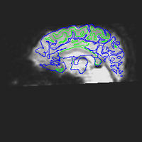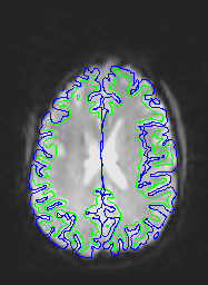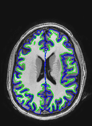 The following images show a T1 image with outlines for the outer boundary of gray matter (blue line) and white matter (green line).