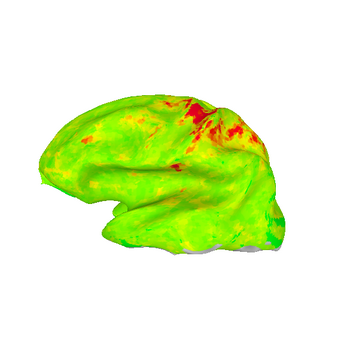 These images show lateral views of surface models. The colors represent the F-statistic at each surface node for each of the motion and distortion correction methods. While there are differences between the images, they are subtle.