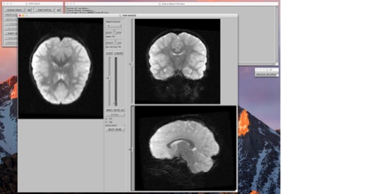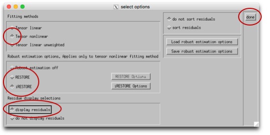 EstimateTensorWLLS -i $data_path/*_proc/*.list ComputeGlyphMaps $data_path/*_proc/*L0_DT.nii open $data_path/*_proc/*.png This should only take a few minutes. When it's finished, you'll have a .png (image) file with a central slice of your data. On top will be a bunch of colored ovals, and these indicate the direction and anisotrophy of the tensors it would calculate. You should be able to see long ovals in the white matter, ovals that seem to follow each other, and ovals with colors that look like a color FA map. At this stage, it's most important to check that your gradients weren't rotated inappropriately (especially if you acquired your data obliquely). Prep the StructuralsIt's useful to have your data ACPC aligned. When you color-ize your FA map, it's useful if "anterior to posterior" in one subject is the same as the next subject. But, we don't want to stretch the data (as you would when you align to a template), just re-orient it. One way to do this is using the AFNI gui. If you have both a T1- and T2- weighted image for your subject, you can start by aligning these two scans together. align_epi_anat.py -anat t1_mprage.nii -epi t2_space.nii -epi_base 0 -epi_strip 3dSkullStrip -edge -epi2anat Then, you can use the AFNI gui to add markers to the T1, and apply these to your T2. Write these datasets out using the gui. Another (probably preferable) way to do this is to use fat_proc_axialize, detailed instructions here. Here, you can specify an atlas to compare your data to, and have it do only the translation/rotation parts of the warp. These two methods will do philosophically similar things, but mathematically a bit different. (Which is to say, don't try to check that one method or the other worked by viewing the results on top of each other.) Note - The fat_proc_axialize notes describe axializing the T2 and then aligning the T1 to the axialized T2. But this isn't your only choice. You could also axialize your T1 to a T1-weighted template, such as MNI152, TT_N27, or something more esoteric, like the Haskins pediatric atlas or a monkey atlas or whatnot. If you need a special atlas to match your data, this will probably dominate the decision to axialize the T1 and align the T2, or the other way around. If you are axializing a T1, the next recommended fatcat step (fat_proc_align_anat_pair) may not work so well. Instead, I'd try align_epi_anat.py. If you ultimately want to compare these DTI data to surface data, I would do this step *before* your freesurfer recon. It's not absolutely necessary (you can align your DTI data back to whatever surface you recon-ed), but it will make your life a bit easier. Just make sure you zero-pad your axialized T1 to a 1mm 256x256x256 grid on your own terms before you start, so they stay in register. Motion, Distortion Correction using DIFFPREPIn order to run diffprep, you need to have a structural image. (To correct a distortion, it's useful to know what an un-distorted image looks like.) The TORTOISE gurus recommend a T2-weighted anatomical with fat suppression. That type of image will match contrast to the DWI images best, but will not have any distortion. In lieu of that, you could use a T1-weighted image, or (in a pinch) the motion-corrected average of all of your b=0 volumes. The axialize step (above) is optional, but useful. DIFFPREP -i $data_path/*_proc/*.list -s <path_to_structural_image> --will_be_drbuddied 0 --do_QC Now, grab a quick cup of coffee, and move on to something else for a bit. This will take a little while (maybe about an hour or two). If you have both a T1 and a T2, and you've added markers to the T1 so that it's AC-PC aligned (again, just rotated, not warped), then you could run this as... DIFFPREP -i $data_path/*_proc/*.list -s <path_to_T2> -r <path_to_ACPC_T1> --will_be_drbuddied 0 --do_QC Blip up blip down with DR_BUDDIIf, as is becoming more and more recommended, you acquired half of your DTI data A-P and the other half P-A, then the next step would be to use DR_BUDDI. In that case, you'll want to do the above steps (import niftis, data check, diffprep) on each of them, and set --will_be_drbuddied to 1. All this does is tell DIFFPREP not to bother with the last few steps, because they'll be taken care of with DR_BUDDI. Then, after you run DIFFPREP, you'll run DR_BUDDI (which is also not a speedy program). The command for this is DR_BUDDI --up_data $data_path/*AP*proc/*_proc.list --down_data $data_path/*PA*proc/*_proc.list --structural <path_to_structural_image> If you're using connectome data (and this probably goes for many other multi-band sequences, as they tend to have long TEs), you may want to throw in a --distortion_level large flag as well, so it knows to allow for the larger distortions. Check your QCYou should now have a folder called QC in $data_path/*_proc. This folder contains a series of useful images showing your data before and after the motion/distortion corrections. Calculate TensorsNow, we'll move into the TORTOISE GUI. This is run using an IDL virtual machine. In future versions, more and more functions will be moved to command line, but right now (version 3.1.1), we've run out of things we can do outside the IDL. In addition to moving to the IDL, you need to convert your data at this point from the new .list format to the old .list format. To do that, use this command: ConvertNewListfileToOld $data_path/*_proc/*_DMC.list Then, you can fire up the IDL cd /Applications/TORTOISE/DIFFCALC/DIFFCALCV25/DIFFCALC/diffcalc_main/ ./calcvm You'll see the splash screen, just hit ok. Now, three windows will pop up. I know, I know, you're wondering what that "sensitize the buttons" thing is. It's ok. You can push it if you want. The buttons on the main menu with be greyed out when you can't do things, and will become black when the function is available. BUT, if you close a window, or if there's some error, everything may get greyed out. At that point, you can "sensitize" the buttons again, and go back on your merry way