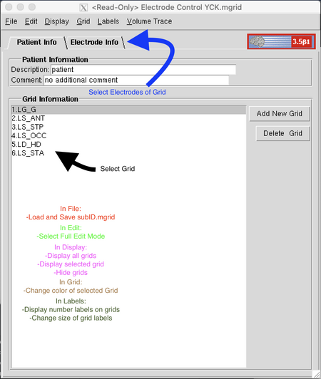 iELVis refers to all electrodes, be they grid, strip, or depth, as "grids" and each individual electrode channel as a "contact"; the rest of this section will do the same. iELVis uses a naming system that gives each grid a unique name as well as a tag identifying its location on the left or right hemisphere and whether the model grid is a grid, strip, or depth electrode. This is written as an "L" or "R" for left/right, a "G", "S", or "D" for grid/strip/depth, an underscore, and the electrode name from the patient's montage (e.g., LG_Grid, RS_PTO, LD_LIns). Each grid must have a unique name not including the LS/RD tag-- i.e., if there are two grids with the same name on each hemisphere, their names should include the left/right designation, not just the tag (e.g., for two amygdalal probes, use LS_LAMY and RS_RAMY, not LS_AMY and RS_AMY)-- two grids with the same name will cause errors later in MATLAB when trying to plot these electrodes.