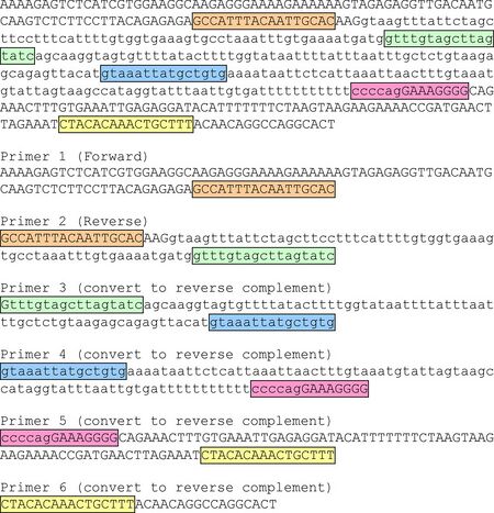The primers are all shown as forward, in order to illustrate the overlapping areas. The ones that need to be reversed are marked. All primers must overlap the 5' and 3' ends in order for the pcr to work.