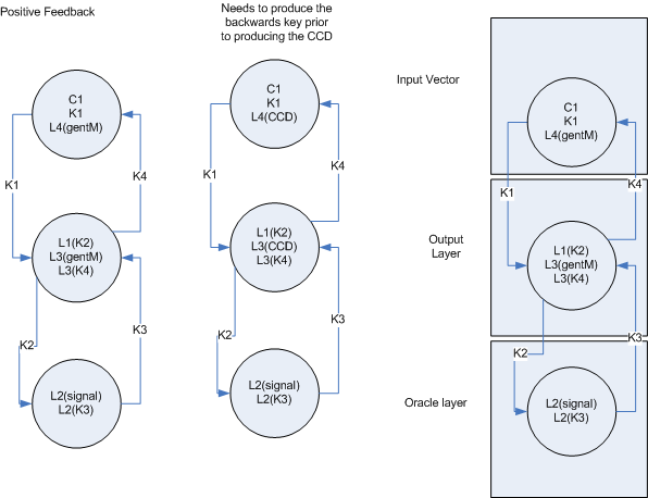 A simple type of ANN is organized into hierarchal layers with all data flowing in one direction. (A feed forward network) In this case, a node in layer one would be able to produce the locks which are opened by layer 2, layer 2 produces the locks opened by layer 3, and so on. In a 'recurrent' ANN, each node would be able to produce the locks of any other node in the network. Some internal logic in the cell would be used to determine when input levels are satisfied and what output to produce.