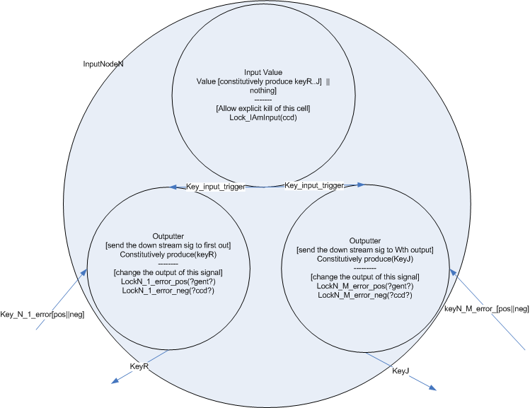 The input node is composed of one cell type which either constitutively produces a single key or not. (Or this cell could just be absent) This key is passed to the output cells of the node. Each output cell receives the key and begins to produce a unique key which is passed to one of the next nodes in the network. This design allows for each output key each to be changed independent of the others by regulating the population level of the output cell for a specific link.