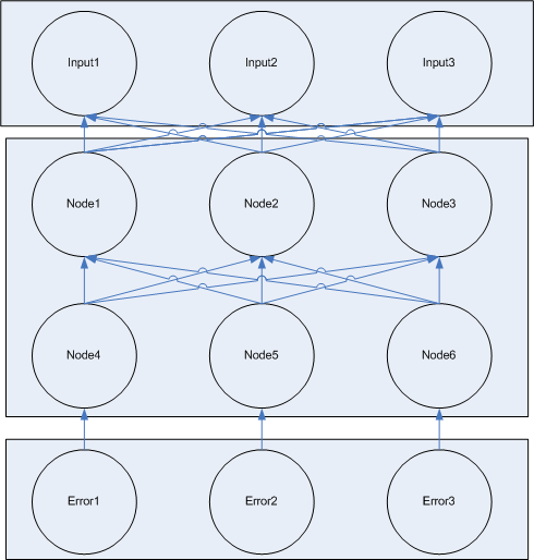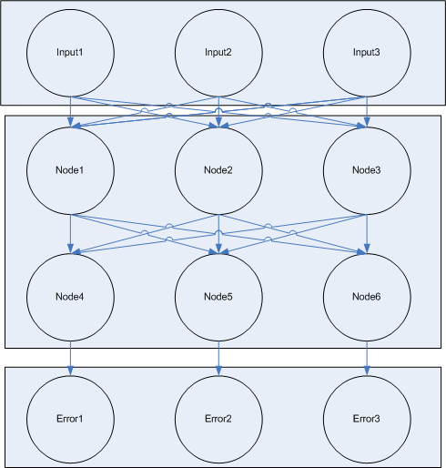 In the learning step, there are two sub steps, each of which is repeated several times. In the first step, information flows from the input nodes down the network to the output/error nodes. Our network is a 'feed forward' network, meaning there are distinct layers with no communication between nodes in the same layer. Input and general nodes are connected to all of the nodes in a lower layer of the network.