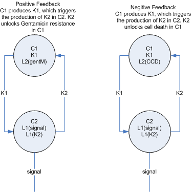 Is there any way to copy a plasmid inside the cell? We could start with a cell that has one positive output plasmid and one negative output plasmid. A negative input key is received, causing the duplication of the negative plasmid, so there's now 2 copies of the same (-) plasmid in the cell and one copy of the positive, so we're more likely to transfer the negative plasmid.