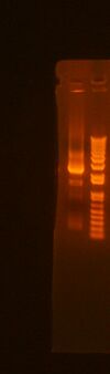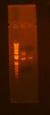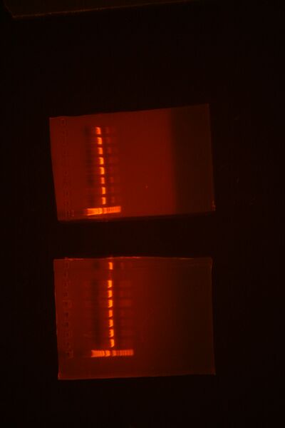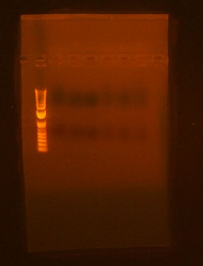 - I want to gel purify the larger of the two fragments, so I cut out the entire 7kb section of all six rows, hoping to capture even a low concentration of the correct piece.