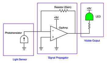 OpAmp: a signal propagator. More generally, an OpAmp detects and amplifies a difference between the currents into its plus and minus inputs. In this circuit, the OpAmp compares the current from the phototransistor (minus input) to a zero current from ground (plus input). With the addition of the feedback resistor between the output and the minus input, the OpAmp converts a small current signal into a larger voltage signal. The OpAmp (plus feedback resistor) is analogous to the transcription/translation machinery in the cell, which translates an OmpR signal into synthesis of LacZ.