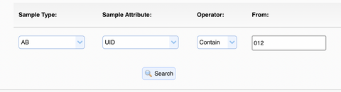 - Type the value of the attribute you wish to search for in the ‘From:’ string value box and click search. For example, to search for a mouse sample with the UID attribute containing the letters MAC, select ‘MUS’ in the ‘Sample Type’ menu, ’UID’ in the ‘Sample Attribute’ menu, ‘Contain’ in the ‘Operator’ menu, and type MAC in the ‘From:’ text box.
