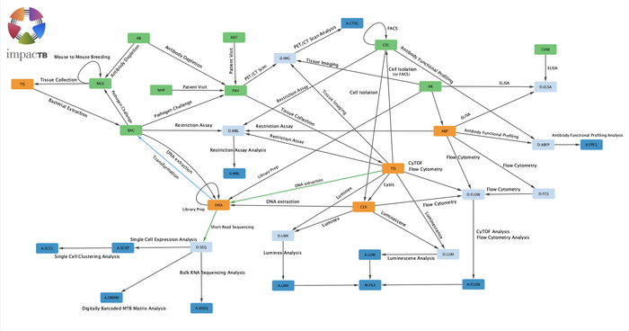 SEEK stores experiments, which are then connected to their respective protocol and metadata. Since all data in an experiment is inherently linked, SEEKs approach storing data makes it easy to visualize the connections between all of the data. Experimental assays that describe experimental procedures are connected to samples and models in the system. The figure below shows all of the IMPAcTB assay connections between the respective sample types. Data is uploaded to SEEK in excel sheets, where it is then linked to its respective protocol, which is stored as a document. The SEEK system is built to support both individual and groups of scientists, due to its data sharing and management features.